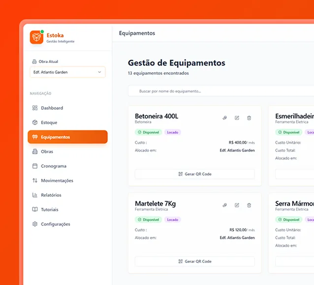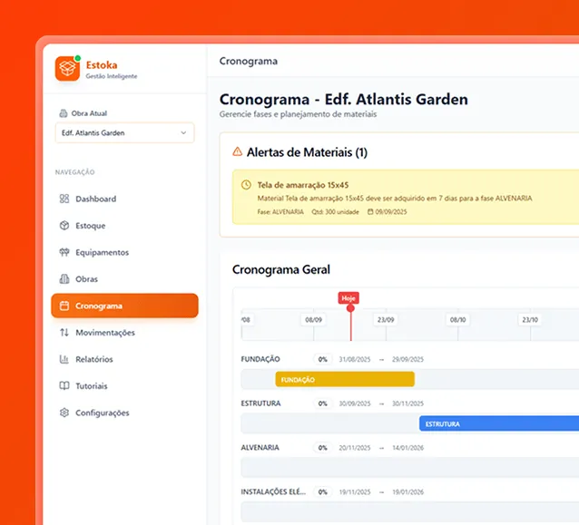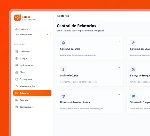 O Estoka foi feito justamente pra quem gerencia várias frentes de obra. Cada obra tem seu próprio controle, e você gerencia tudo em um só lugar.
